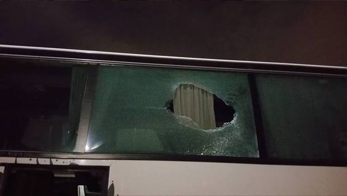 Il pullman sul quale viaggiavano, durante il tragitto che porta allo stadio di San Siro, è stato preso d'assalto da un gruppo composto da cinquanta supporters nerazzurri, che hanno iniziato a lanciare sassi e petardi in direzione del mezzo. Due vetri sono stati infranti (foto in alto e in basso), ma fortunatamente l'agguato si è concluso senza conseguenze.