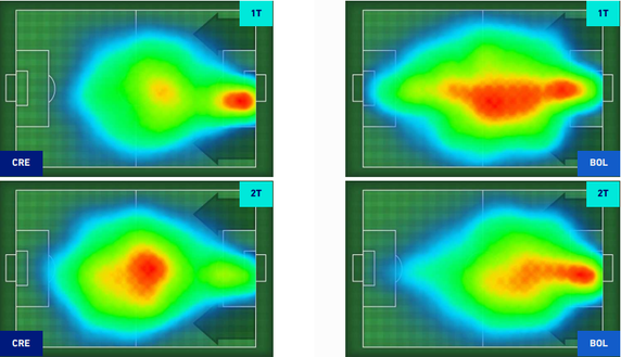 Di facile supposizione, la mappa di calore della Cremonese mostra la partita disputata dai grigiorossi. Contratta, rinunciataria, schiacciata nella propria metà campo. Leggermente meglio nel secondo tempo, quando la morsa del Bologna si è allentata poiché forte del risultato maturato – all'intervallo era già 0-3 rossoblù. Arnautovic ha garantito maggior verticalità rispetto alle ultime uscite del Bologna, di matrice orizzontale e generalmente sterile. Può essere la chiave per aprire le difese nelle ultime partite di questo campionato.