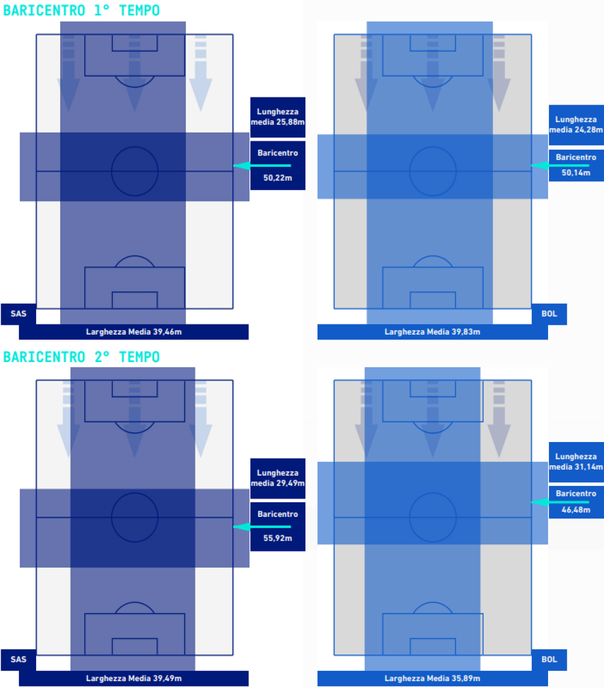 Baricentro, appunto. Nel primo tempo è sostanzialmente identico per le due squadre, nel secondo il Sassuolo riesce a sporgersi un po' di più nella metà campo avversaria. Non molto, a dire il vero; sicuramente non abbastanza da impensierire per la seconda volta la porta di Skorupski.