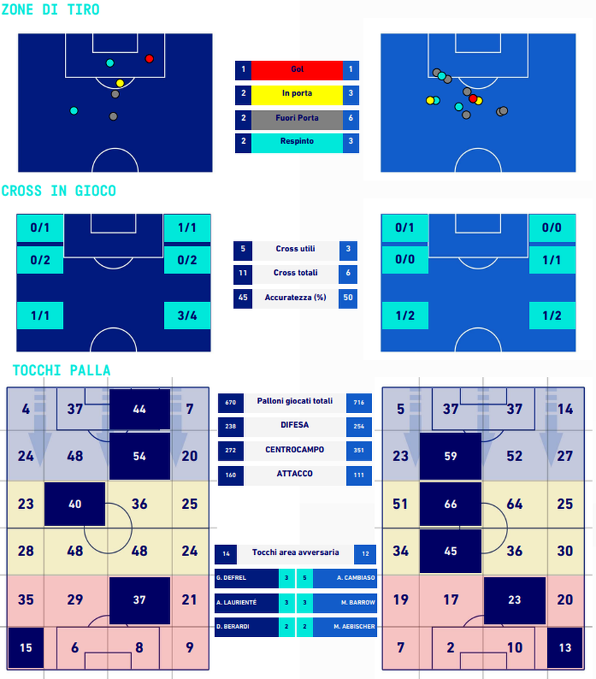 Quindi i tocchi in area, o in generale i metodi e le soluzioni offensive adottate dalle due compagini. Il Sassuolo tira decisamente poco, il Bologna un po' di più ma sono quasi tutti tiri finiti fuori dallo specchio della porta (6). Fa pensare che sia Andrea Cambiaso il giocatore più pericoloso dei rossoblù: ben sei tocchi in area di rigore avversaria (!), con Barrow a seguire con tre. E in effetti i neroverdi non hanno mai dovuto sventare azioni pericolose nella propria area di rigore.