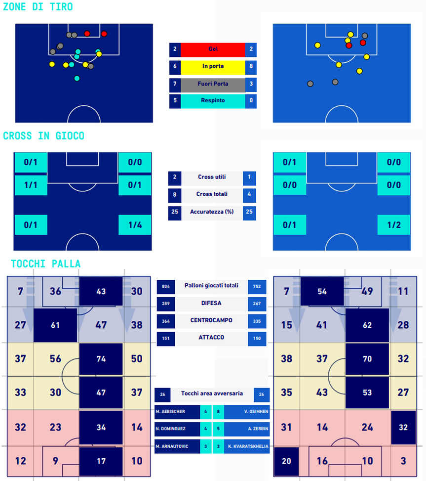 Otto tiri, due nello specchio. Bene sull'arrivare a conclusione, ma c'è tempo ancora per migliorare la precisione. Aebischer e Dominguez i migliori su quest'aspetto con 4 tocchi in aerea avversaria; irragiungibile Osimhen con otto tocchi e due goal.