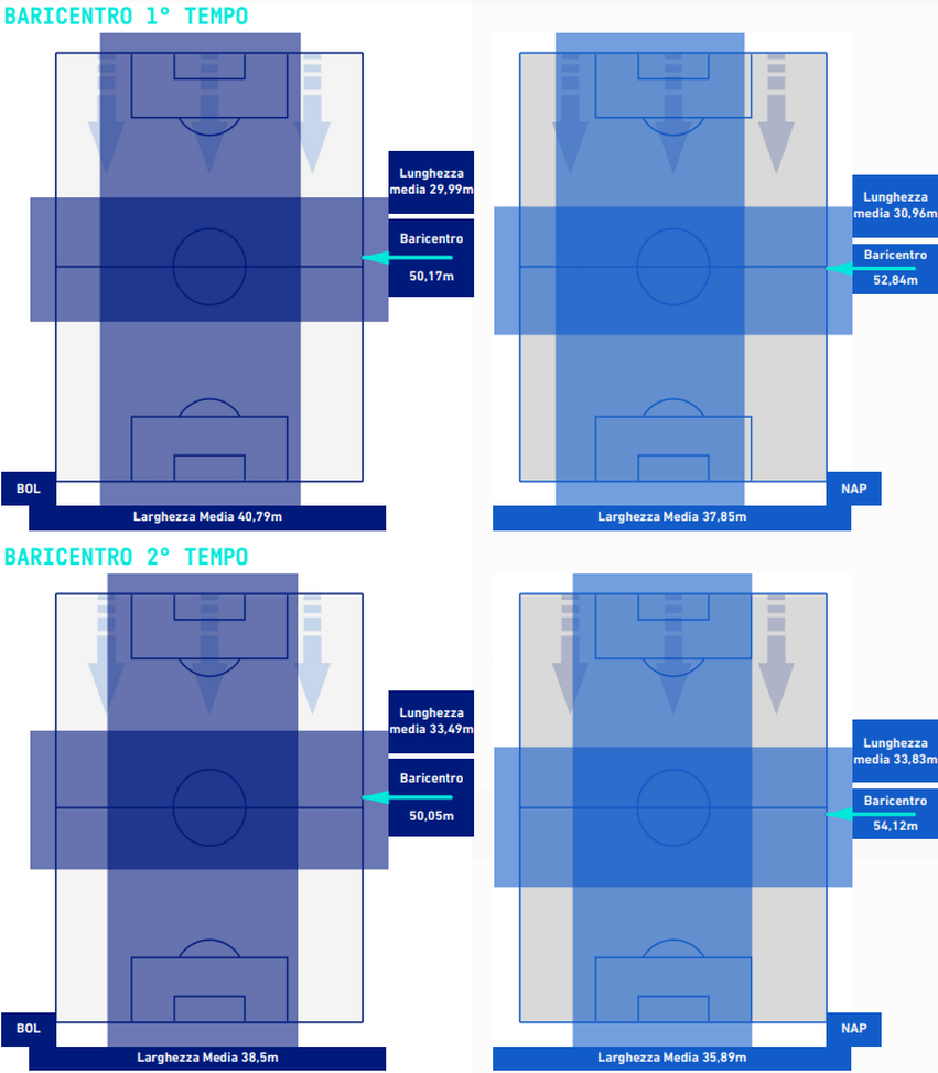 Il baricentro rispecchia bene quanto detto sulle posizioni medie. Bologna stranamente più largo del Napoli, e schiacciato nella seconda frazione poiché succube degli attacchi (invani) dei partenopei.