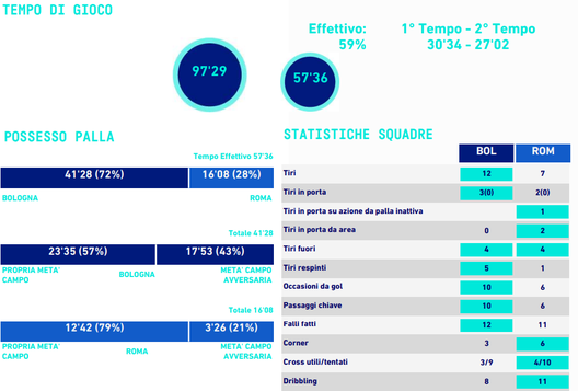Reti bianche al Dall'Ara, Bologna e Roma non vanno oltre lo zero-a-zero. Il report della Lega Calcio permette di tenere conto delle idee di Thiago Motta e della loro riuscita, circa. A partire dal possesso palla, fondamentale per mantenere il controllo invocato dal tecnico italo-brasiliano. Il dato recita 72% a 28% a favore rossoblù: l'avversario era José Mourinho, storicamente simpatizzante di un gioco attendista e non propositivo. Le caratteristiche delle due squadre hanno creato le condizioni ideali per attendere un dato del genere – ma in ogni caso, la Roma ha creato decisamente di più del Bologna.