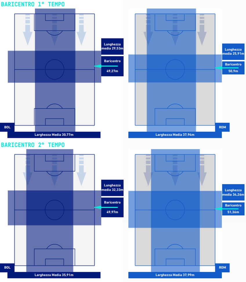 E nonostante tutto, il baricentro delle due squadre è praticamente simile. Nel primo tempo c'è una sottile differenza di lunghezza, con i giallorossi più corti – e una difesa più alta. Il piano della Roma era di sfruttare l'entusiasmo delle seconde linee e la loro fisicità, cosa praticamente riuscita dal momento che il Bologna non si è mai affacciato in maniera pericolosa dalle parti di Svilar, se non con conclusioni da fuori. Questo è un dato che deve far riflettere Thiago Motta, senza dubbio. L'attacco pesante Orsolini-Arnautovic-Barrow non è riuscito a calciare nemmeno una volta nell'area di rigore avversaria.