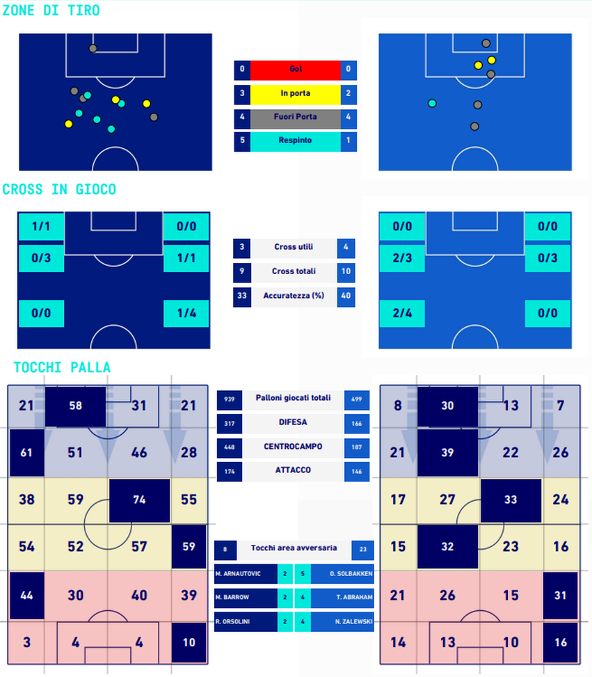 E come detto precedentemente, se il tridente pesante non ha calciato nemmeno una volta in area di rigore avversaria, è perché in area di rigore avversaria ci stai poco. Dati assurdi: 2 tocchi a testa per Arnautovic, Barrow e Orsolini in area giallorossa. I più alti di tutta la squadra, naturalmente. Questo è uno dei maggiori nodi da sciogliere per Thiago per questo finale di campionato. Ultimo dato interessate: com'era facile intuire, la zona di campo con più tocchi è la mattonella di centrosinistra della trequarti rossoblù (74 tocchi). Merito di un Cambiaso utilizzato da falso mediano, un imposizione tattica sfruttata anche da Theo Hernandez per un certo periodo.