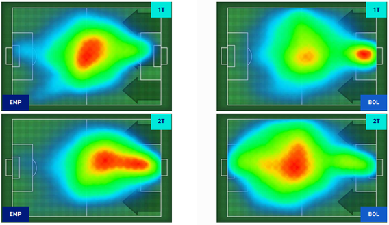 Adesso passiamo alle mappe di calore, con il rosso come espressione massima di intensità d'occupazione di campo. Come evidenziato, l'Empoli mantiene un assetto omogeneo nei due tempi, più conservativo nella seconda frazione di gioco perché forte del 2-0 maturato da Akpa-Akpro. Il Bologna, invece, ha fatto molta fatica ad occupare con convinzione il suo centrocampo, andando un po' dove capitava senza cavarci molto. Più aggressivo nel secondo tempo, decisamente sbilanciato in avanti grazie anche alle forze fresche inserite. Ma non è bastato, e anzi, ha portato l'Empoli a siglare il 3-0 con Cambiaghi.