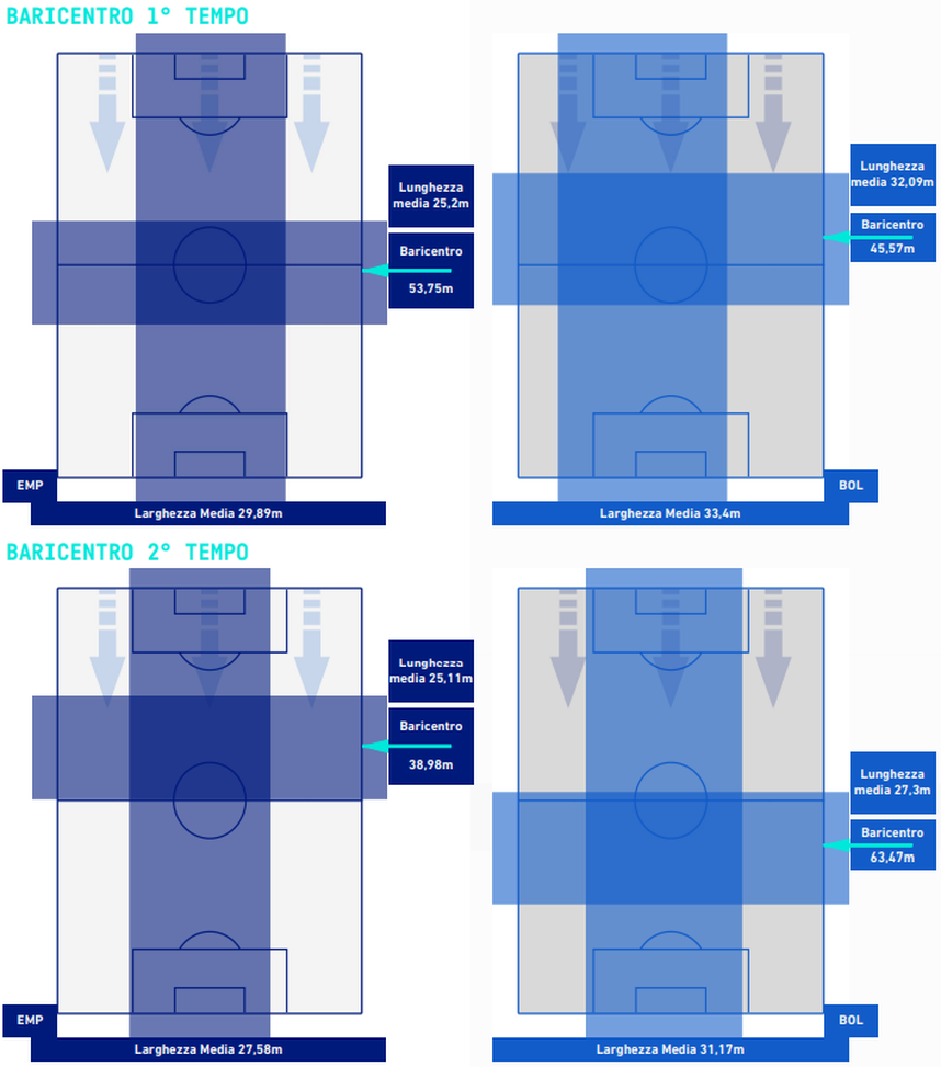 Quindi arriviamo al baricentro, che sostanzialmente conferma quanto detto precedentemente. I toscani si preferiscono stretti ed equilibrati, senza strafare offensivamente. I rossoblù probabilmente registrano il proprio record stagionale di altezza del proprio baricentro: addirittura 63 metri nel secondo tempo.