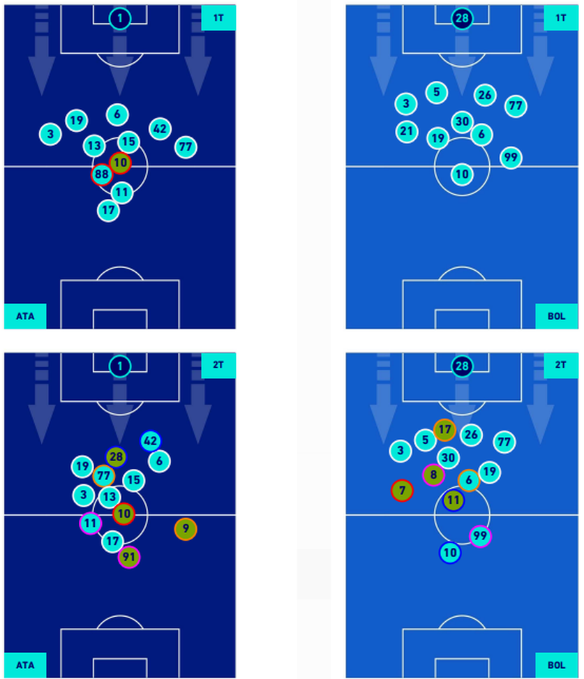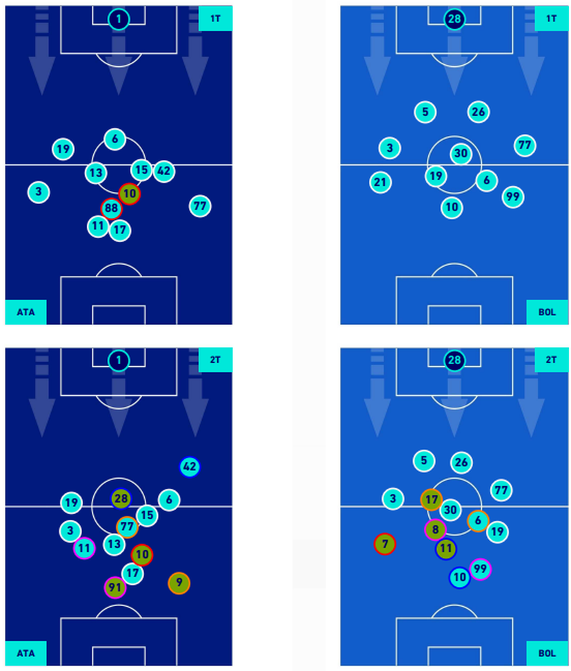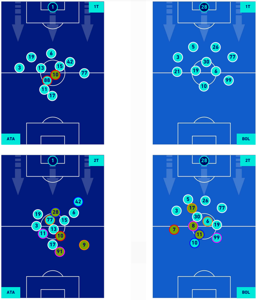 Queste invece sono le posizioni medie con il possesso del pallone. L'Atalanta ha cercato quasi sempre di sfondare per vie centrali: nel primo tempo ha assaltato il Bologna con il tridente Boga-Hojlund-Lookman (Pasalic è uscito per infortunio dopo venti minuti) che non ha saputo scalfire Lucumi e Soumaoro; stessa sorte è toccata poi a Muriel e Zapata, simboli di un'Atalanta che non c'è più.