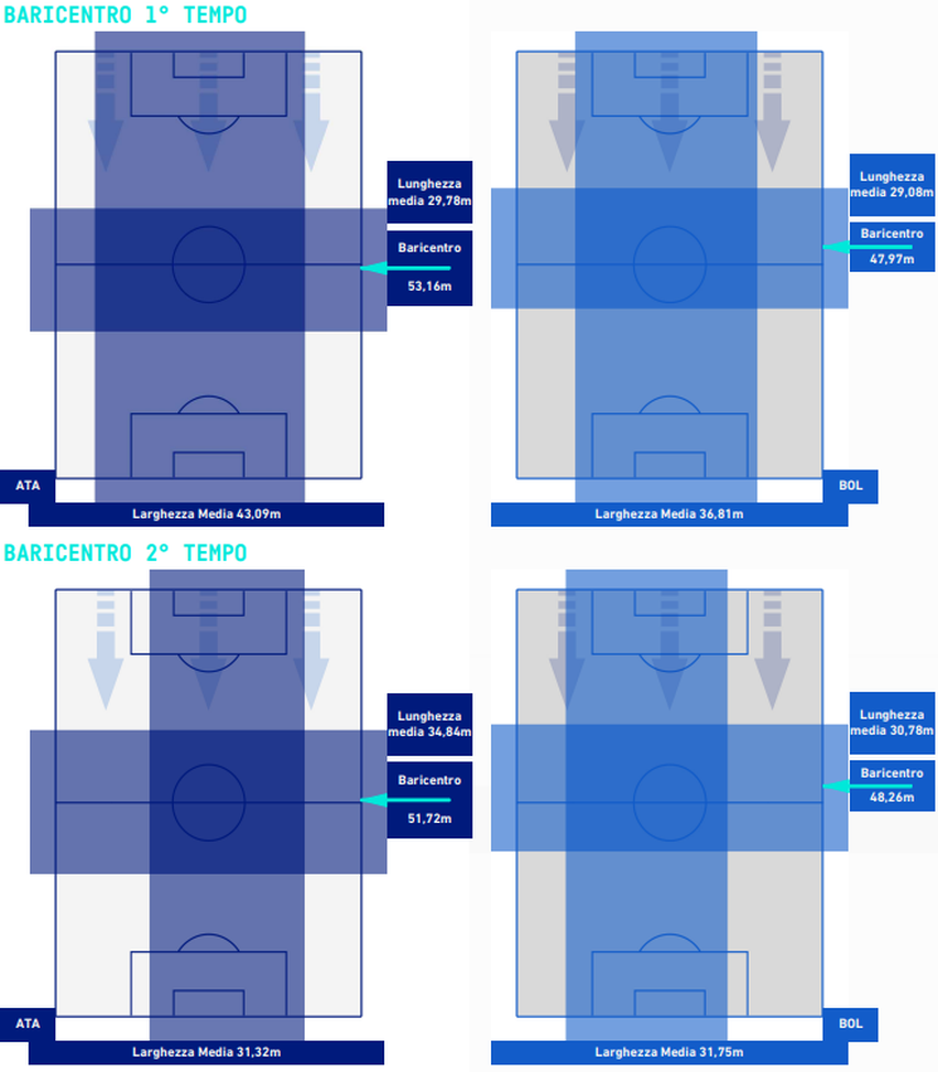 Le infografiche sul baricentro rafforza ancora di più i concetti espressi precedentemente. L'Atalanta è aggressiva e si propone con un baricentro stretto ma espresso in lunghezza, tutto il contrato del Bologna che per contenere i nerazzurrri ha optato per la compattezza. Possiamo notare anche uno sbilanciamento dei baricentri nel secondo tempo, con Gasperini che dirotta verso il centrosinistra le offensive atalantine (merito dell'ingresso di Muriel) e il Bologna che di pronta risposta supporta Posch con più uomini possibili.
