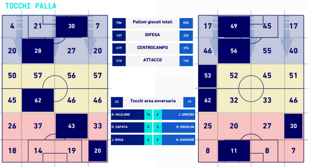 Una statistica che rende chiaro il caos offensivo creato da Hojlund in area di rigore: 14 tocchi nel cuore rossoblù. Numeri straordinari che tuttavia hanno trovato resistenza nelle parate di Skorupski; e in generale, un'Atalanta combattiva ma non in grado di spodestare il muro Soumaoro-Lucumi. Incoraggiante l'apporto di Zirkzee, che in un'abbondante mezz'ora riesce a classificarsi al primo posto per numero di tocchi in area avversaria nel Bologna. Da aggiungere alle numerose giocate spettacolari in mezzo al campo,