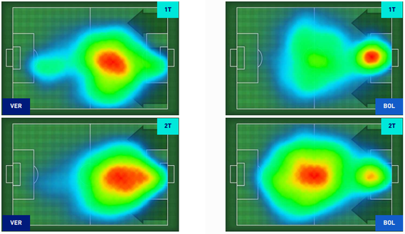 Se il possesso palla prolungato si mostra come accento sulla gravità della partita di venerdì sera, le heatmap delle due squadre spiegano abbondantemente il motivo del risultato. Con la colonna sinistra referente dell'Hellas Verona, la colonna destra è dei rossoblù; e specialmente quella riguardante il primo tempo (in alto a destra) è clamorosa nel suo significato. I felsinei hanno a malapena calpestato la metà campo del Verona, e la zona più affollata è stata a pochi metri da Skorupski. Possesso palla sì, idee no. Nella seconda frazione il dato migliora leggermente, ma ancor più rilevante sono le due grafiche riguardanti gli scaligeri – non si registra alcun specifico dominio territoriale. Questo argomento rafforza ancora di più il senso della tesi di quest'analisi: il Bologna si è fatto male da solo.