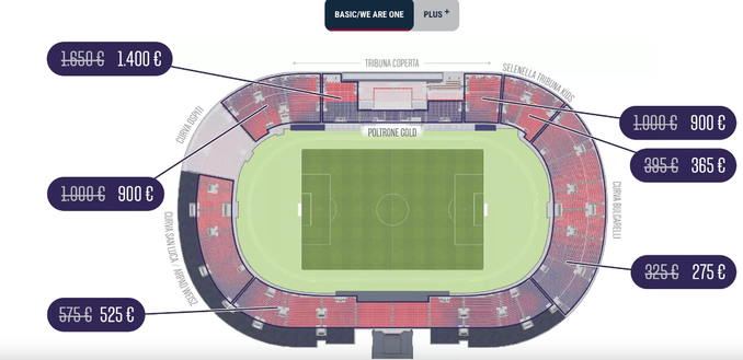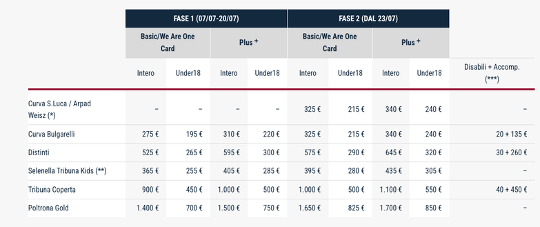 La fase 1, come detto, partirà dal 7 luglio alle ore 10 e terminerà il 20 luglio alle 22 e sarà la fase di rinnovo delle tessere con prezzo scontato e posti sbloccati per abbonati '24-25. I prezzi vanno dai 275 euro della curva Andrea Costa, ai 375 euro Kid'Stand, 525 euro nei Distinti, 1400 euro in Tribuna Gold e 900 euro per la Tribuna Coperta. Previsti sconti per gli Under 18. Dalle 15:00 del 21 luglio alle 22:00 del 22 luglio ci sarà la fase di cambio posto dove si potrà effettuare il cambio scegliendo tra quelli rimasti liberi dopo la FASE 1. Questa finestra temporale è dedicata in maniera esclusiva agli abbonati della FASE 1: i posti in prelazione saranno sbloccati e potrai così scegliere un nuovo posto tra quelli rimasti liberi eventualmente non rinnovati. La Fase 2 sarà attiva dalle 10:00 del 23 luglio per quanto riguarda la vendita libera su tutti i posti disponibili e non sarà attivo lo sconto rinnovo. In questa fase sarà aperta anche la Curva San Luca-Weisz. I prezzi saliranno a 325 euro per Curva San Luca e la Curva Bulgarelli, a 575 euro per i distinti, 395 euro per la Tribuna Kid’s, 1000 euro per la tribuna Copeta e 1650 euro per la rtribuna gold.