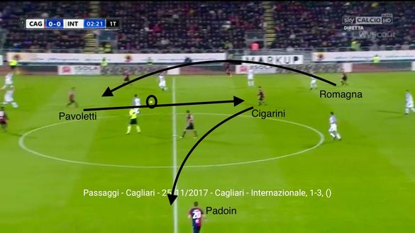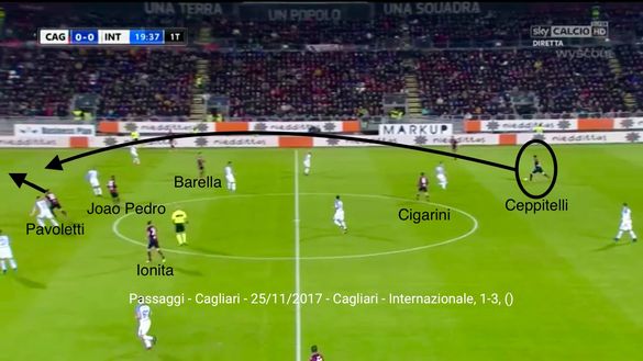 2. L'altra chiave tattica in fase di possesso palla e il lancio lungo: i rossoblù non hanno sbocchi "corti", Cigarini è marcato e la squadra, essendo molto alta, non fornisce soluzioni di gioco semplici al centrale. Di conseguenza Ceppitelli lancia lungo su Pavoletti che tenta di attaccare lo spazio alle spalle di Skriniar