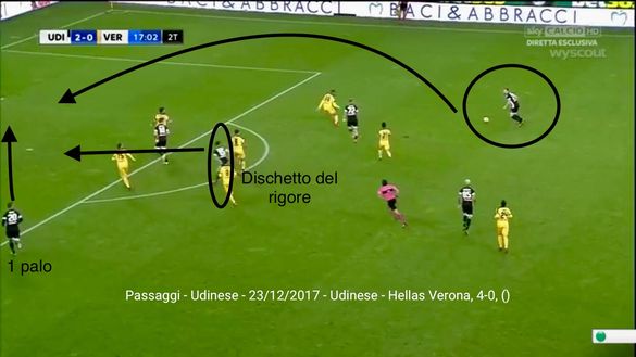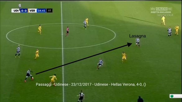 1 - Palla dall'esterno alla seconda punta: Dopo aver girato palla nel reparto arretrato l'Udinese cerca sempre il corridoio per verticalizzare: se le due mezzali sono marcate, ecco che viene incontro per ricevere Lasagna, che ha più attitudine di seconda punta e funge da raccordo tra i reparti. L'ex attaccante del Carpi può girarsi e giocare col compagno Maxi Lopez, dotato di buona tecnica e bravo nello scambio stretto, per poi attaccare la porta.