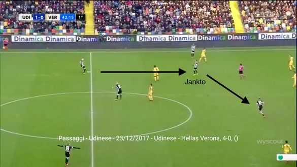 Anche in fase di costruzione l'Udinese sfrutta in modo notevole il centrocampo: i giocatori chiave sono Jankto e Barak, entrambi molto dinamici, tecnici e forti, con ottima attitudine all'inserimento. Sono loro due che vengono incontro tra le linee per ricevere palla dai difensori ed impostare, avendo più qualità di Behrami che in fase di possesso palla ha alcuni limiti. Barak, inoltre, ha licenza di svariare su tutto il fronte offensivo. Lo sviluppo del gioco friulano parte spesso dai difensori centrali che pazientemente girano palla per poi cercare il corridoio e verticalizzare proprio per una della due mezzali che viene incontro e imposta. Andiamo a vedere le tre principali situazioni della fase di possesso palla dell'Udinese: