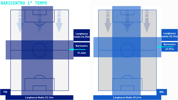Se il solo possesso palla non fosse abbastanza, c'è anche il baricentro a dimostrare come sia stata la Fiorentina ad essersi incartata pur avendo mantenuto maggiormente palla. Il Bologna è riuscito comunque a mantenersi solido e pericoloso, tenendo il proprio baricentro all'altezza di 47 metri per tutta la partita. Un'altezza prudente ma non del tutto rinunciataria.
