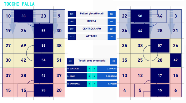 In questa sezione troviamo i tocchi totali per squadra divisa in zone. I riquadri di colore blu sono le zone più calpestate col pallone per ogni riga orizzontale, e mostrano una Fiorentina stabile ma prevedibile, preferendo la corsia di centro-sinistra di Biraghi, Barak e Saponara, proprio autore del momentaneo 1-1. Il Bologna si dimostra più imprevedibile, costruendo dal basso dal centro destra per arrivare alla trequarti viola dalla sinistra. Un dato sorprendente è quello dei tocchi in area avversaria dei giocatori: Stefan Posch, da terzino, ha toccato il pallone in area fiorentina una volta meno di Zirkzee e tanto quanto Orsolini, rispettivamente punta ed esterno sinistro.
