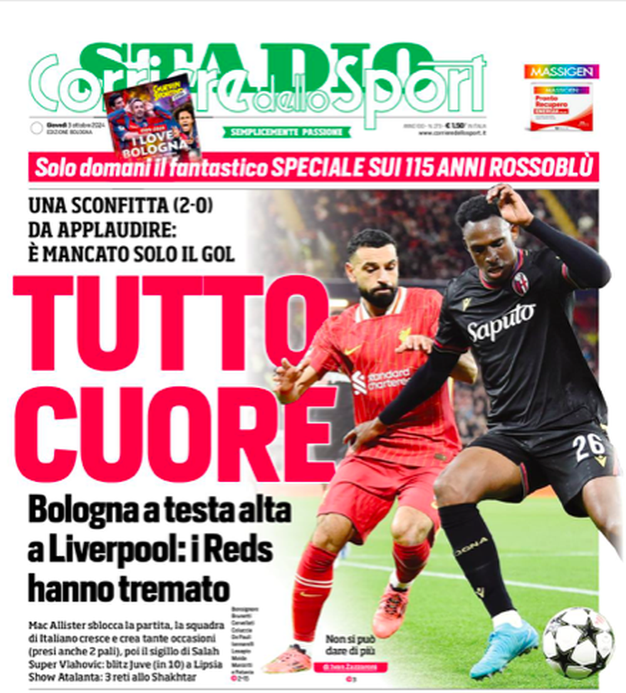 'Tutto cuore' è invece il titolo di Stadio. 'Bologna testa alta a Liverpool: i reds hanno tremato'
