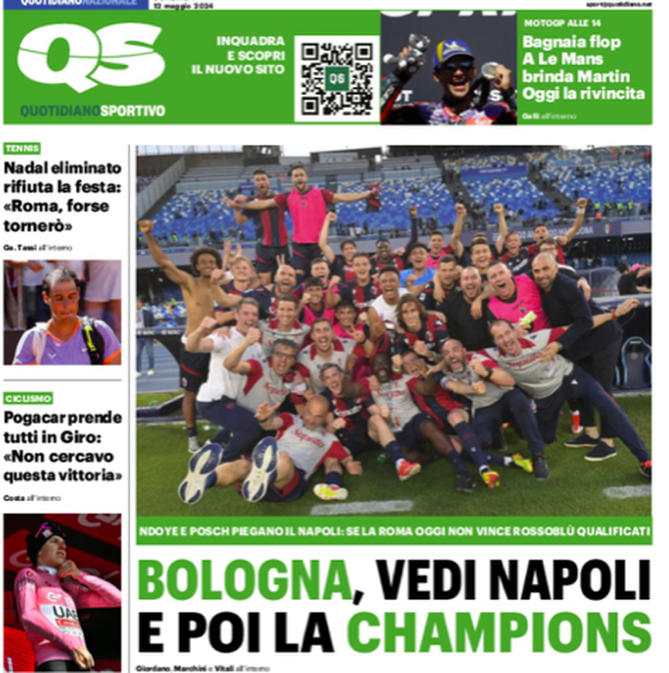 'Bologna, vedi Napoli e poi la Champions' è invece il titolo del Resto del Carlino che apre con la foto di gruppo dei rossoblù al Maradona. 'Il Bologna è da leggenda' si legge nelle pagine interne.