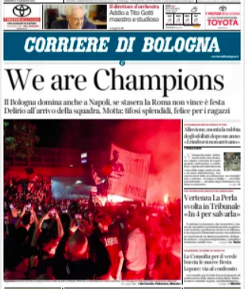 Titolo chiaro per il Corriere di Bologna che apre in prima pagina con la festa di Casteldebole al ritorno della squadra e il titolo 'We are champions'. Nelle pagine interne la gioia della squadra e un 'Bologna Champions' a caratteri cubitali.