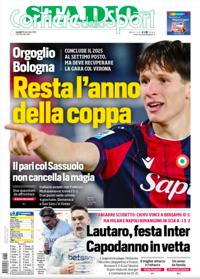 'Resta l'anno della coppa' è il titolo del Cor Sport che sceglie di celebrare la Coppa Italia a fine 2025. 'Il pari col Sassuolo non cancella la magia'.
