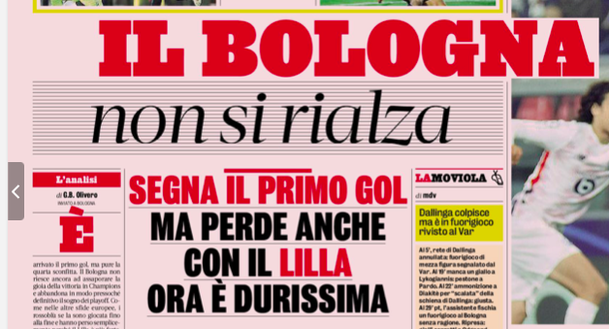 Quarta sconfitta consecutiva in Champions per il Bologna, questa l'apertura di Gazzetta dello Sport che titola: 'Il Bologna non si rialza. Ora è durissima'.
