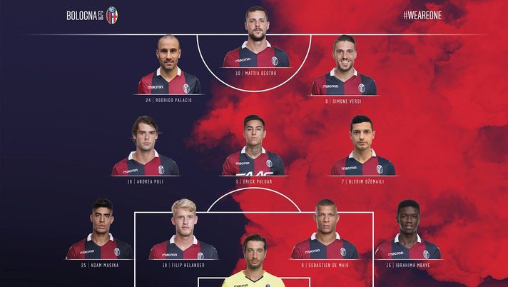 In porta Mirante, mentre la difesa sarà a 4 con Masina e Mbaye a spingere sulle fasce mentre la coppia di centrali sarà De Maio ed Helander. A centrocampo Pulgar agirà come regista affiancato da Poli e Dzemaili. Trio d'attacco composto invece da Destro punta centrale con Verdi e Palacio ad affiancarlo.