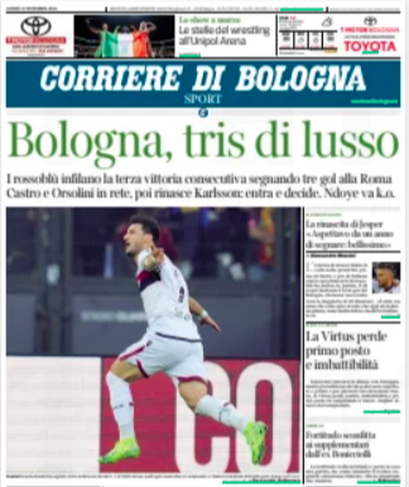 'Bologna, tris di lusso' è il titolo del Cor Sport con l'esultanza di Orsolini in prima pagina. Il Bologna infila la terza vittoria consecutiva e segna tre gol alla Roma. Karlsson entra e decide.