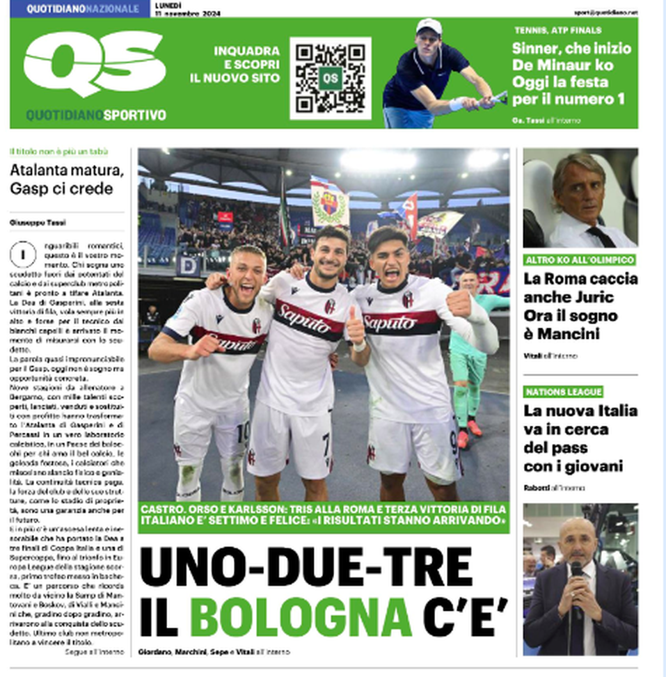 Gioco di parole sul Qs Resto del Carlino: 'Uno, due, tre, il Bologna c'è' è il titolo della pagina sportiva con la foto dei protagonisti dei tre gol (Karlsson, Orsolini e Castro).