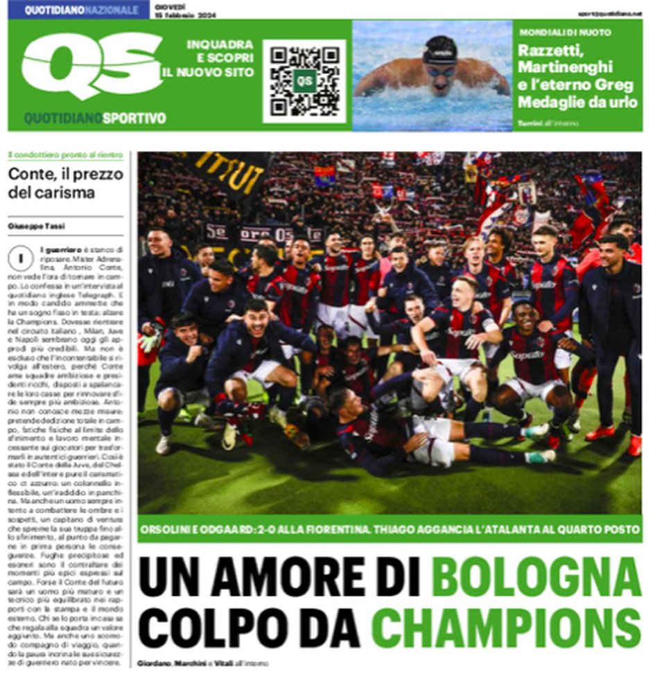 Un amore di Bologna: colpo da Champions titola il Resto del Carlino che poi nelle pagine interne scrive 'Boato da Champions'. E Castro tifa da casa.
