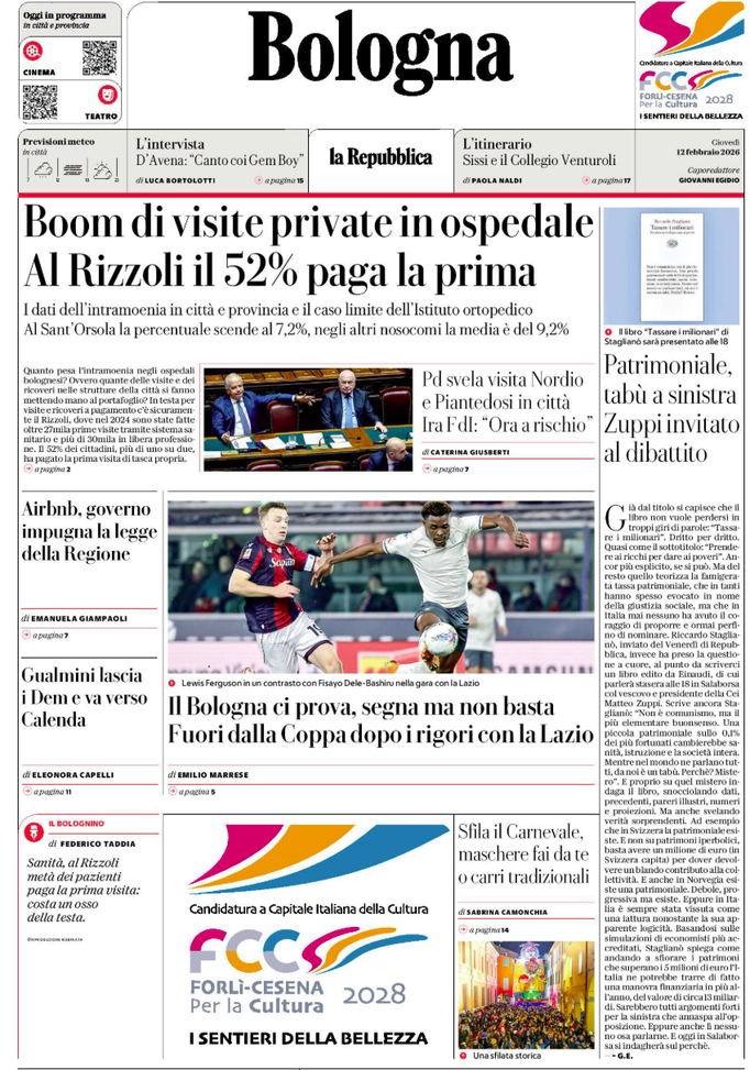 'Il Bologna ci prova, segna ma non basta. Fuori dalla Coppa Italia dopo i rigori contro la Lazio', apre Repubblica Bologna.