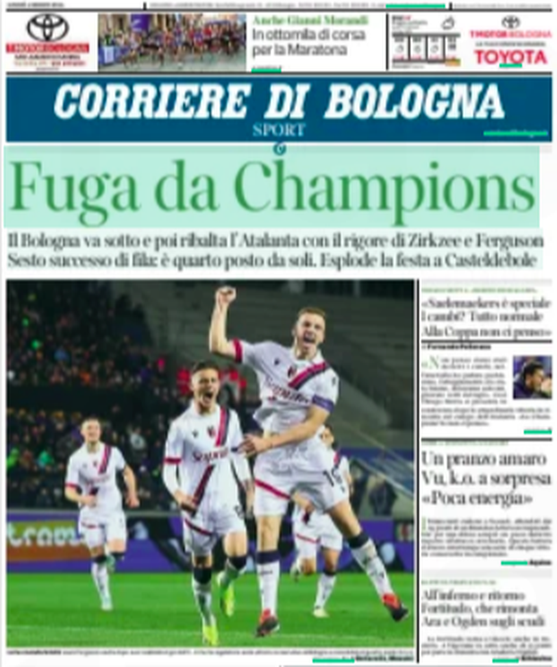 'Fuga Champions' è la prima pagina del Corriere di Bologna con la foto dell'esultanza di Lewis Ferguson sul gol del raddoppio rossoblù: sono sei vittorie di fila e quattro punti di vantaggio sulla Roma.