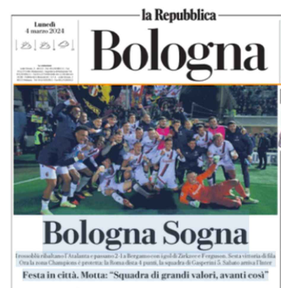'Bologna sogna' è infine la prima pagina di Repubblica Bologna che scrive 'città in festa. Motta: squadra di grandi valori'. Ora i punti di vantaggio su Gasperini sono cinque.
