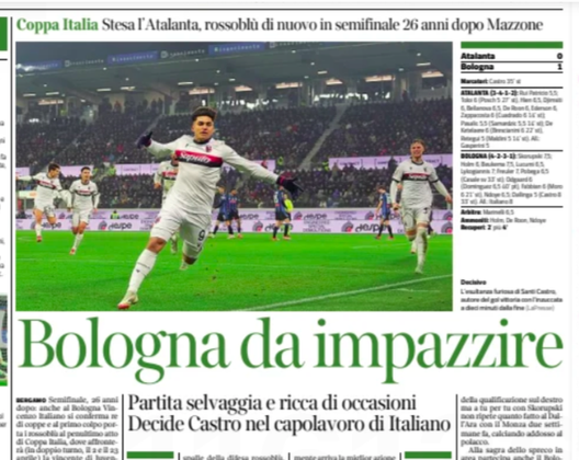 'Bologna da impazzire' è il titolo scelto dal Corriere di Bologna dopo l'impresa di Bergamo: è semifinale 26 anni dopo