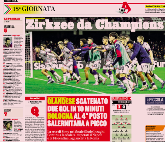 Non solo zona Europa per il Bologna ma quello della sedicesima giornata contro la Roma si profila come uno scontro diretto per la Champions League. La Gazzetta della Sport di oggi titola così dopo la vittoria di Salerno: "Zirkzee da Champions"