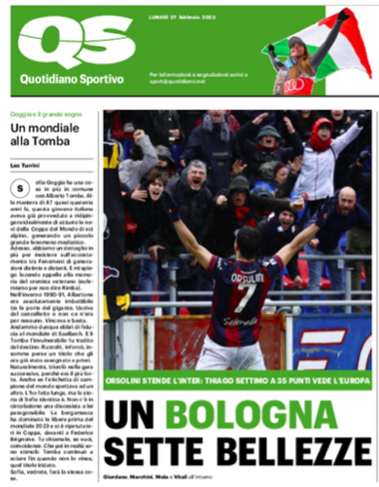 Un Bologna Sette Bellezze è invece il titolo del Resto del Carlino con Orsolini in esultanza di spalle sotto la curva Andrea Costa.