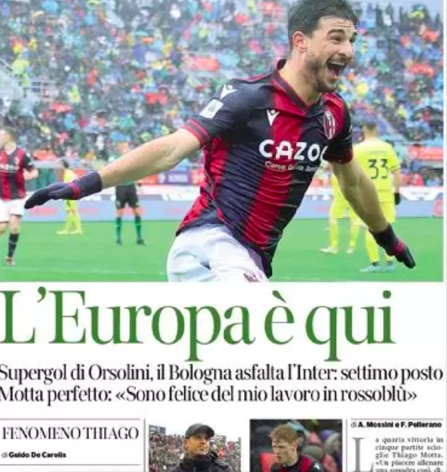 'L'Europa è qui' è invece il titolo del Corriere di Bologna con la squadra rossoblù settima dopo il successo sull'Inter.