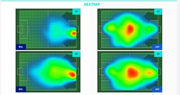 Con l'aiuto delle heatmap possiamo capire quale è stato il piano partita delle due formazioni. Come successo varie volte negli ultimi tempi, soprattutto contro le big, il Bologna ha mantenuto una posizione in campo molto raccolta e bassa, soprattutto nel primo tempo in questo caso. Quello che può sorprendere è la mappa di calore che fa riferimento alla Juventus: Allegri ci ha abituati a una fase difensiva compatta, con la squadra disposta al limite della propria area di rigore. Domenica sera, invece, ha voluto cambiare quasi radicalmente tattica, andando a pressare alti i giocatori del Bologna e spingendo molto, una volta recuperata la palla.