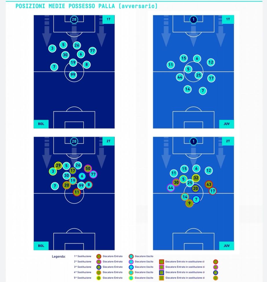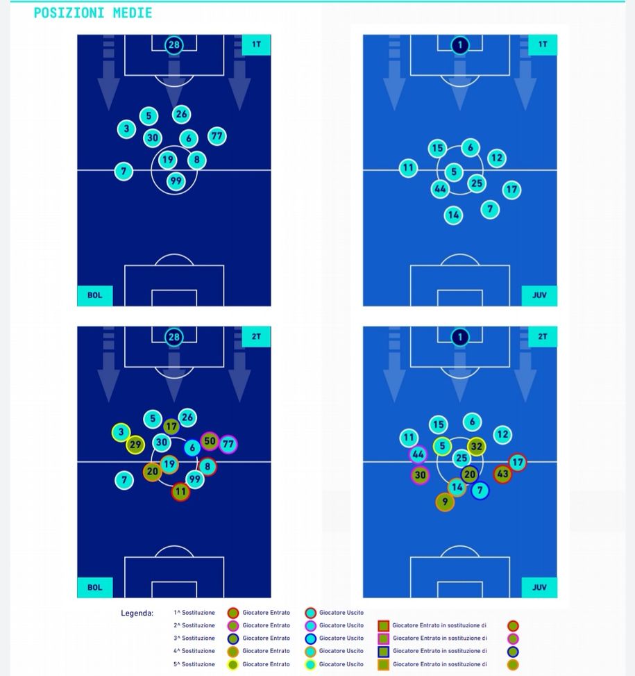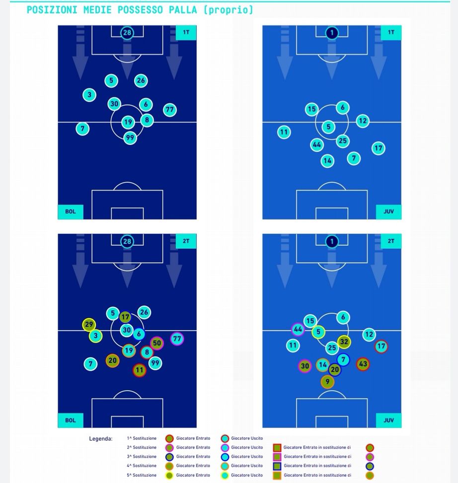 Grazie all'osservazione delle posizioni medie occupate in media durante la partita, sono ancora più evidenti le trame tattiche delle due squadre. Un Bologna molto compatto e stretto, con quattro centrocampisti molto vicini. Nonostante Dominguez (8) partisse come esterno di sinistra, ha agito molto dentro al campo affiancando i suoi tre compagni di reparto. Nella Juventus è da sottolineare come lo schieramento cambi tra fase difensiva e offensiva: quando ha avuto il possesso il modulo era il classico 3-5-2 con Cuadrado (11) e Kostic (17) molto larghi. In fase di difesa il colombiano rimaneva più basso rispetto al serbo, mentre Alex Sandro (12) scalava nella posizione di terzino sinistro.