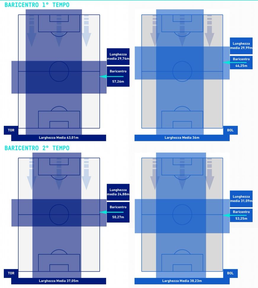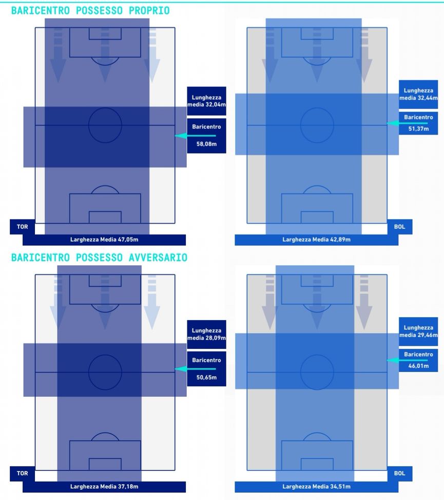 Dall'analisi del baricentro medio tenuto dalle due squadre si evince come il Torino, soprattutto nella prima frazione di gioco, abbia attaccato e pressato molto di più rispetto al Bologna. Inoltre i granata hanno sviluppato molto bene il gioco sugli esterni, con un'ampiezza di squadra superiore ai 43 metri. Nella ripresa i rossoblù hanno cercato di alzare un po' il proprio baricentro, senza però riuscire a creare grandi pericoli dalle parti di Milinkovic-Savic.