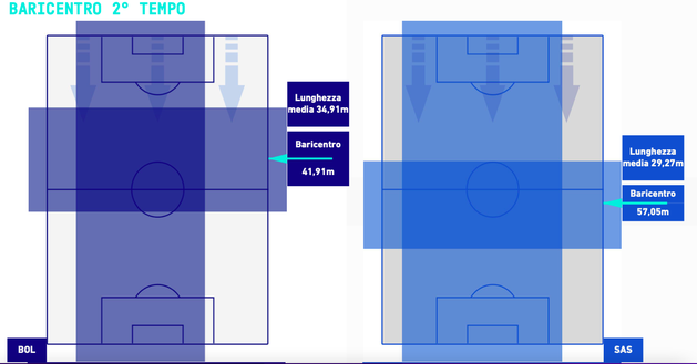 Nel secondo tempo, invece, il Bologna, forte anche del doppio vantaggio, ha deciso di aspettare di più, portando il Sassuolo a scoprirsi e a lasciare spazi in contropiede. Più che una costrizione da parte dei neroverdi, l'abbassamento del baricentro appare una soluzione voluta per far scoprire l'avversario.