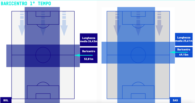 Bologna molto abile anche in termini di baricentro nel primo tempo. La squadra di Motta ha avuto un buon Ppda a quota 10, cioè il numero di passaggi concessi all'avversario diviso le azioni difensive nella metà campo avversaria, mantenendo però un equilibrio generale con baricentro alto ma non eccessivamente: 52 metri contro i 49 del Sassuolo. L'idea di Motta era attaccare senza esporsi alle ripartenze neroverdi.