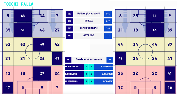 Considerando invece i tocchi di palla, si capisce come Motta abbia scelto di attaccare maggiormente sul lato sinistro del campo, cioè con la catena Lykogiannis-Soriano, a cui si è aggiunto Lucumi autore dell'assist. Se si guarda la mappa del campo con i numeri all'interno (il Bologna è quello di sinistra), i rossoblù da centrocampo fino a trequarti hanno preferito il lato sinistro e solo negli ultimi sedici metri si è andati a destra con più tocchi di palla (17 contro 7). Tra i singoli giocatori, Arnautovic, Ferguson ed Aebischer sono stati i tre elementi a toccare di più la palla in area di rigore.