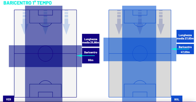 Per imprimere meglio il proprio gioco il Bologna ha bisogno di giocare il più possibile vicino all'area di rigore avversaria. Sia che si tratti di impostare contro squadra chiuse, vedi il Cagliari, sia che si tratti di rubare palla in avanti per creare pericoli nell'altra metà campo, a Motta serve che i suoi si impossessino del campo. Contro il Verona c'è stata una grande difficoltà nel primo tempo, con un baricentro a 47 metri dietro la metà campo e che ha costretto il Bologna a giocare palla lontano dalla porta e inibito l'uscita con qualità della manovra. La conseguenza è stata la minore creazione di pericoli nei pressi dell'area.
