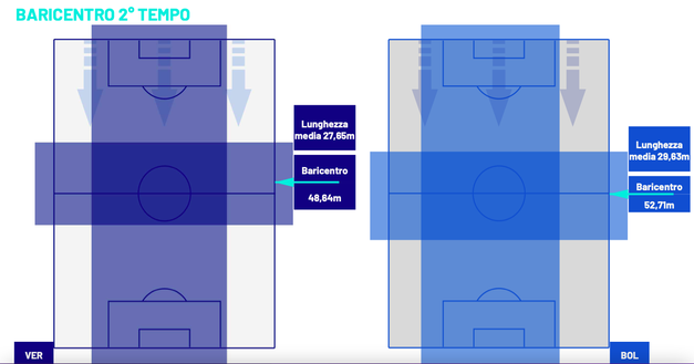Meglio nella ripresa dove il Verona ha ceduto sette metri di campo mentre il Bologna li ha guadagnati salendo a 53 metri.