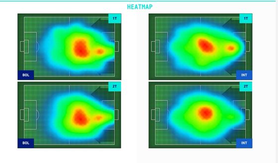 Le heat map evidenziano come l'Inter abbia giocato un po' più alta rispetto al Bologna, volendo imporre il proprio gioco. I rossoblù, dal canto loro, ha retto bene la pressione nerazzurra. La mappa mostra un'ampia zona rossa al centro del campo per quello che riguarda il Bologna: sta a significare che Thiago Motta ha voluto tenere la squadra molto compatta e stretta in mezzo al campo.