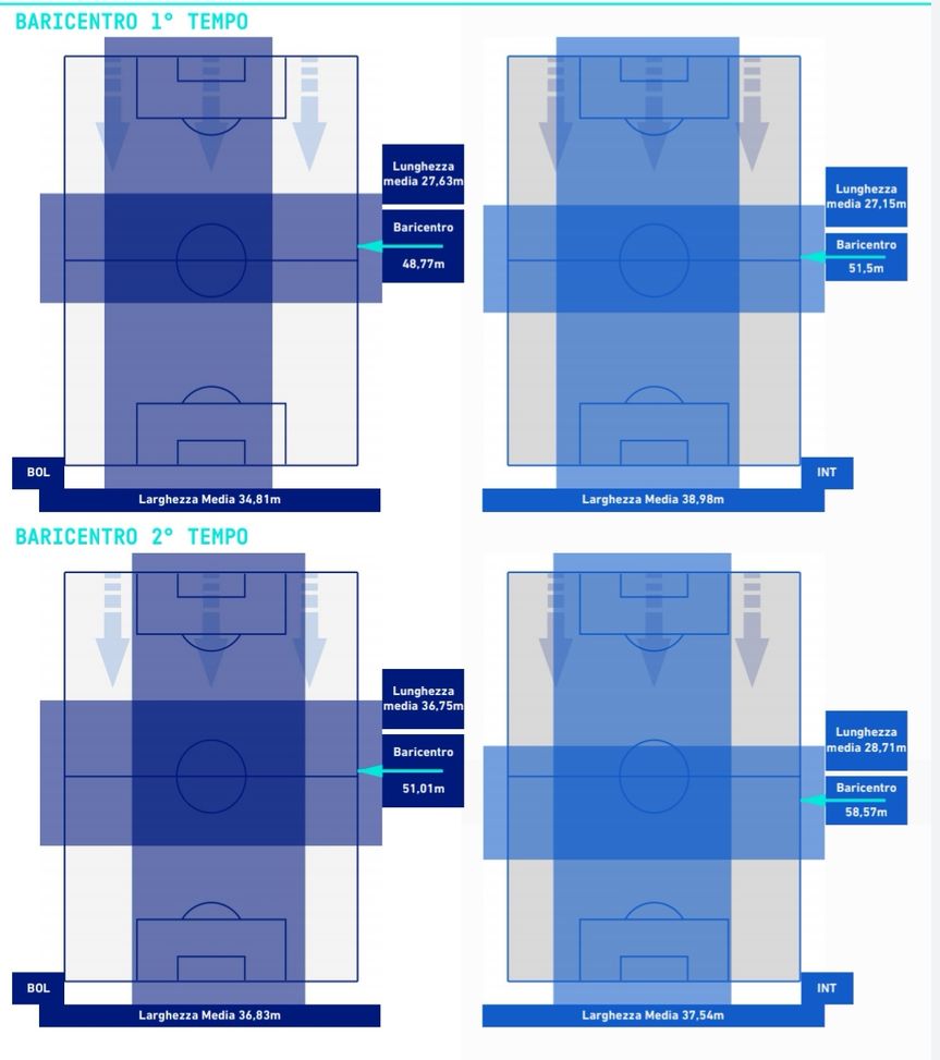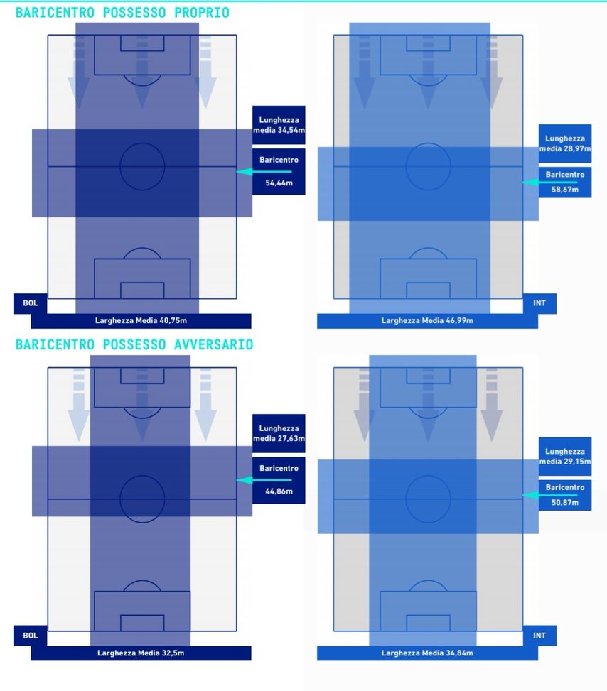 Per quanto riguarda l'analisi del baricentro medio delle due squadre, possiamo dedurre che in fase di non possesso il Bologna ha difeso più bassa rispetto all'Inter. Di conseguenza, in fase di proposta, è avvenuto l'esatto contrario: i rossoblù hanno avuto un baricentro più arretrato in fase d'attacco rispetto ai nerazzurri.