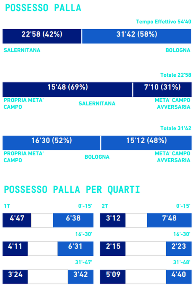 Un possesso palla che sfiora il 60% per il Bologna, indice di una complessiva supremazia di idee di gioco; tuttavia non è bastato, e a dire il vero nemmeno risultato efficiente. Perché è la Salernitana a tentare più tiri dei rossoblù (14 a 10), nonché il doppio in porta (4 a 2). Per cui il gioco di Paulo Sousa ha saputo contrastare al meglio il gioco propositivo di Thiago Motta.