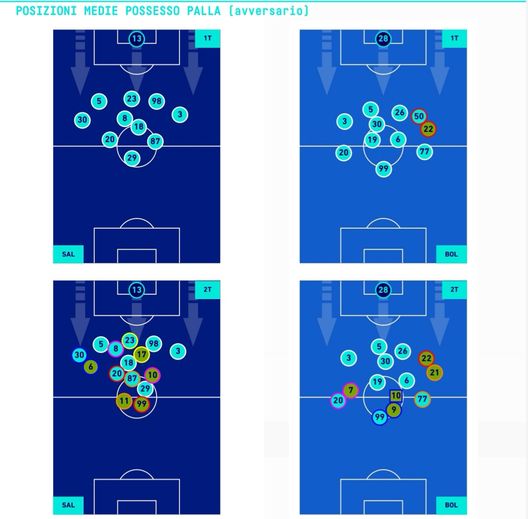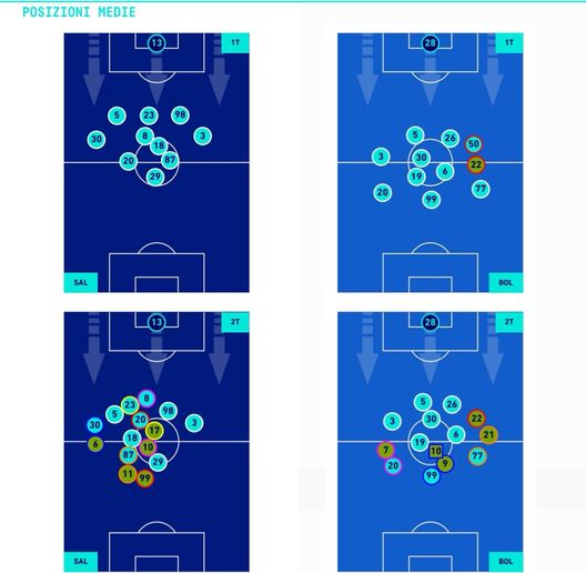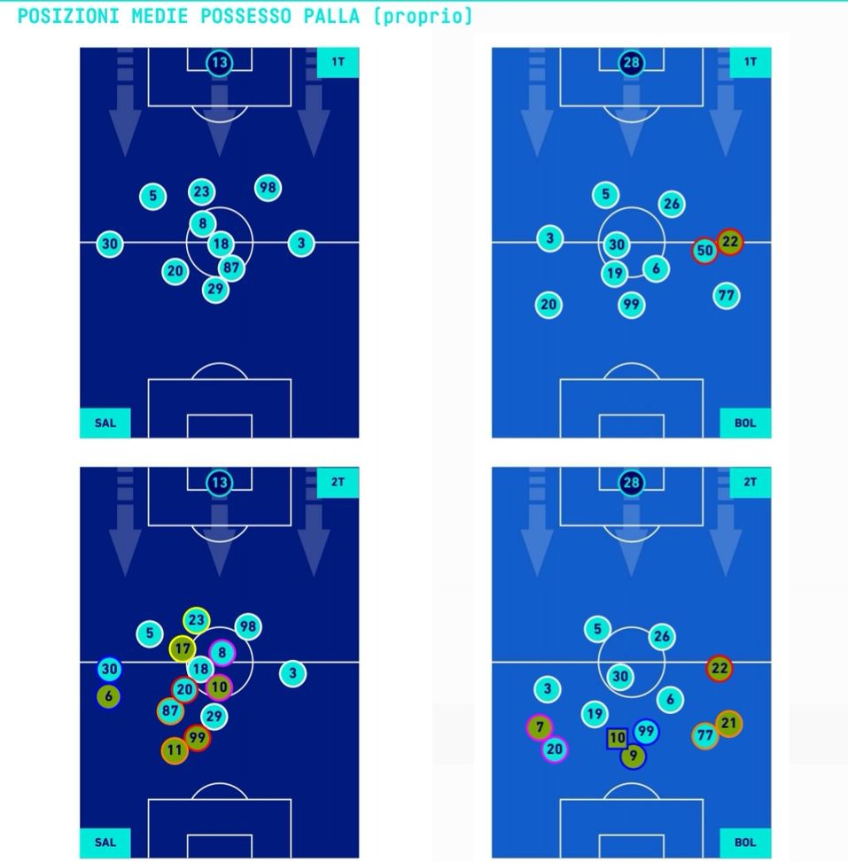 Discorso analogo per le posizioni medie dei calciatori in campo. Da segnalare la propensione offensiva di Lykogiannis rispetto a quella di Cambiaso, uno dei cambi che ha deciso questa partita. Il Bologna ha dimostrato di giocare sotto un'impostazione da 4-3-3, la Salernitana su un 5-3-2.