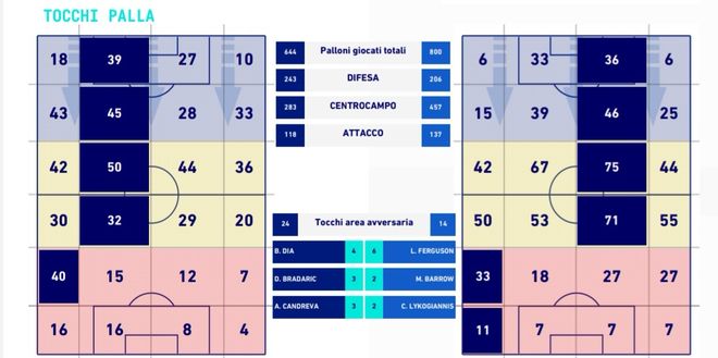 Identica anche il modo di condurre il pallone in zona offensiva. Entrambe le squadre costruiscono da una zona specifica del campo (centrodestra per la Salernitana, centrosinistra per il Bologna) per poi provare a concludere dalla zona estrema del campo, in questa caso la fascia destra dell'Arechi. Lewis Ferguson si conferma uomo più pericoloso rossoblù avendo fatto più tocchi in aera di rigore avversari.